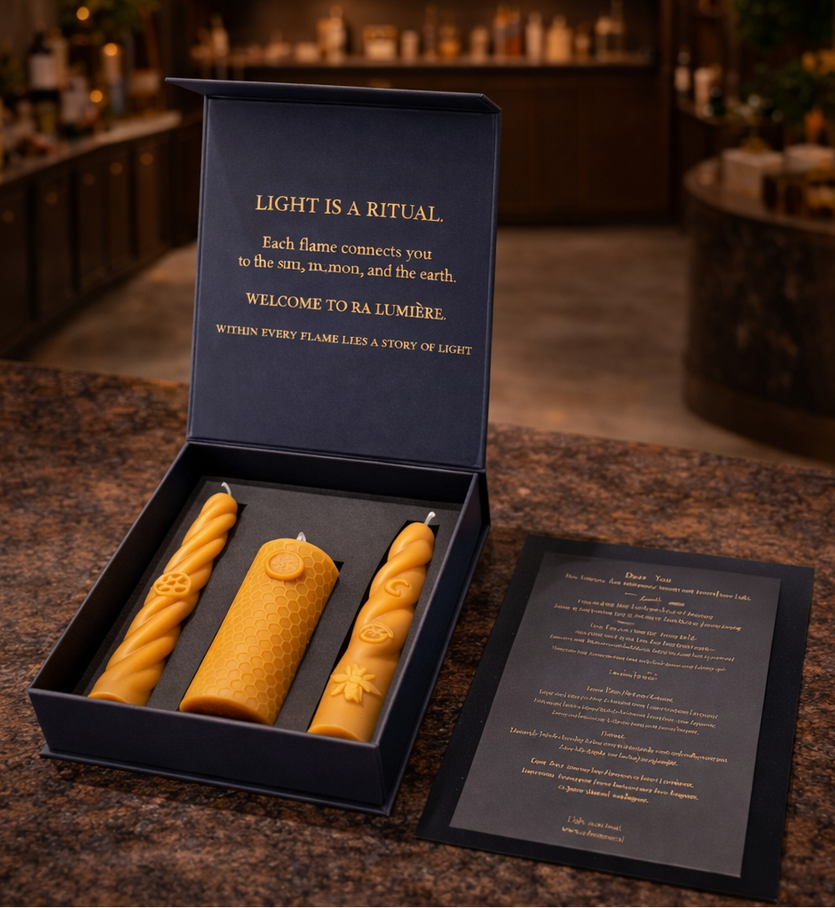 Experience the essence of Ra Lumière with this exclusive ritual set, created for those who want to feel more than just see light. Three hand-poured beeswax candles, each with its own energy, come together in a cathedral-like arrangement that unites balance, strength, and intuition.